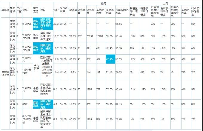 大類(lèi)分析主要看整體銷(xiāo)售結(jié)構(gòu),找出核心大類(lèi)的增長(zhǎng)機(jī)會(huì)點(diǎn)。例如,這組數(shù)據(jù)中不管是整體毛利率還是銷(xiāo)售額增長(zhǎng)率,都低于行業(yè)均值。細(xì)分處方藥、非處方藥及中藥等品類(lèi)的情況可以看出,處方藥的同環(huán)比銷(xiāo)售額以及銷(xiāo)售占比均低于行業(yè)值,而毛利率卻高于行業(yè)值。可以得出,年初制定處方藥為核心增長(zhǎng)大類(lèi)的策略沒(méi)有落地。所以,接下來(lái)做中類(lèi)、小類(lèi)跟單成分分析的時(shí)候需要進(jìn)行針對(duì)性監(jiān)控。